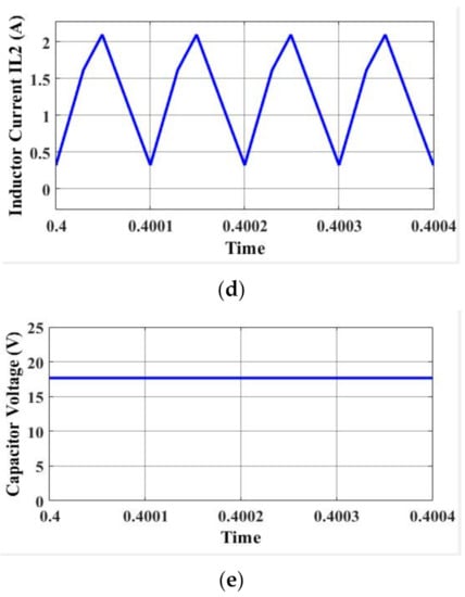 Similarly, the inductor L2 is connected in series to the input source at the interval of time δ2. The current across the inductor increases to the maximum value of 2.2 A, and the remaining time the inductor is associated in series to the load and the current across the inductor decreases linearly and reaches its minimum value of 0.4 A. The average inductor current across the two inductors iL1 and iL2 is 1.7 A. Figure 7c,d highlight the converter working in continuous conduction mode. During the time interval δ1T, the capacitor C1 is connected in parallel to the inductor L1. During this time, the capacitor discharges its energy and reaches to minimum value and the capacitor charges via inductor L1 reaching its maximum value of 18 V. Figure 7e, shows the average capacitor value of step-down operation mode at 17 V.