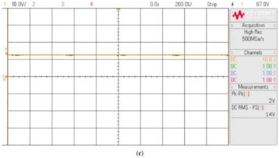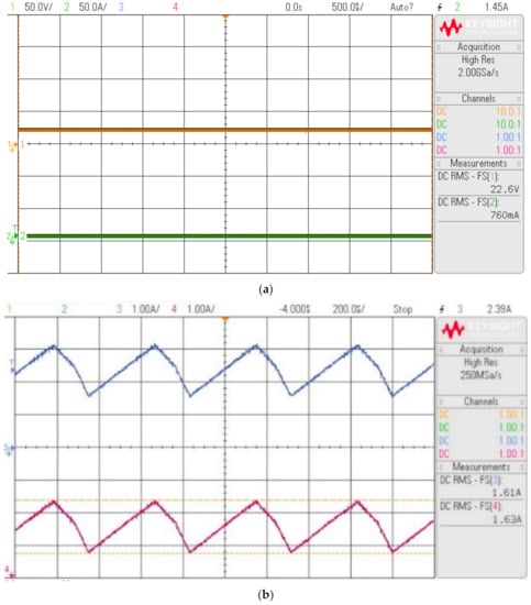 Figure 10 shows the HIL results of the proposed hybrid zeta converter in step-down operation mode. As shown in Figure 10a, the experimental output voltage of the converter in step-down mode for a 36 V input voltage was 22.6 V. For a duty cycle of 33%, the theoretical voltage obtained from Equation (10) is 25 V. Figure 10b depicts the proposed hybrid converter output current of 760 mA. The inductor L1 was connected in parallel with the input source during the time interval δ1T. As a result, the current across the inductor reached a maximum of 1.61 A, and the inductor was connected in parallel to the capacitor C1 for the rest of the time. As a result, the current across the inductor decreased linearly. Similarly, at time interval δ2T, the inductor L2 was connected in series to the input source. The current across the inductor increased to its maximum value of 1.63 A, and the inductor remained connected in series to the load for the rest of the time, so the current across the inductor decreased linearly. The average inductor current across the two inductors iL1 and iL2 was 1.61 A. Figure 10b confirms that the converter operates in continuous conduction mode. The capacitor C1 was connected in parallel to the inductor L1 during the time interval δ1T, so the capacitor discharged its energy and reached its minimum value. Figure 10c depicts the average capacitor value in the step-down operation mode at 14 V.