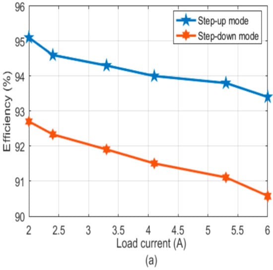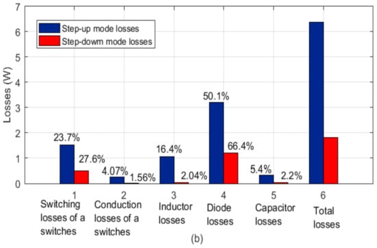 Figure 11 illustrates the converter efficiency curves and loss distribution in the step-up and step-down converters. The step-up converter was more efficient than the step-down converter, as illustrated in Figure 11a. In step-up mode, the proposed converter achieved a maximum efficiency of 95.2%. Furthermore, Figure 11b depicts the power loss distribution of every element in the proposed converter in both operating modes. From the calculated values, the proposed converter diode losses have a more major influence on converter performance.