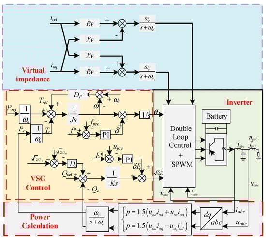 The existing inverter control strategy can be adopted when these DGs are connected to the microgrid. However, as the DGs scale gradually increases, the conventional control strategy may fail to work properly. Therefore, scholars proposed a VSG technology with the characteristics of self-balancing feasibility, rotational inertia and droop characteristics of a synchronous machine, that can be used in DGs and microgrid inverter control to improve system stability [6,7,8,9,10]. Ref. [11] compared the dynamic characteristics of droop control and VSG control, then concluded that droop control is a special form of VSG control (J = 0, D = 0). Compared with traditional droop control, VSG control has advantages, such as virtual damping and inertia. Ref. [12] proposed using a VSG control strategy in microgrids, which improves the closed-loop system dynamic response without changing the frequency accuracy compared to traditional droop methods. In [13,14], VSG provides virtual damping and inertia to realize the dynamic frequency regulation during the short period in a microgrid, respectively. These studies take advantage of a VSG to enhance the stability and reliability of a microgrid; in [15], a simplified VSG virtual inertia controller is introduced by Zhang B. It analyzes the impact of main control parameters on system stability and dynamic response. In addition, data-driven and reinforcement learning methods are gradually applied to the control field. Ref. [16] proposed a data-driven virtual synchronous generator (VSG) optimization control strategy, enabling DGs to adjust their control variables, according to current observations in a model-free manner, control system frequency and power dynamics. Although numerous studies on using a VSG control strategy for renewable energy have been conducted, they rarely consider the power quality problems caused by the imbalance mixed non-linear loads for the microgrid.