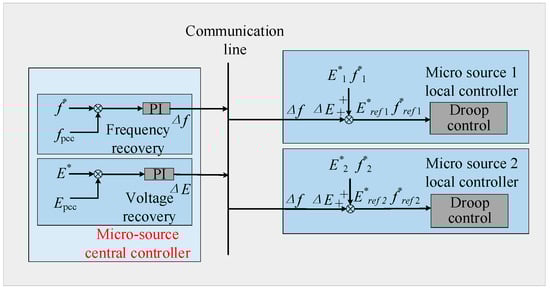 The output frequency fpcc and output voltage Epcc are collected at the microgrid before transmitting to local controllers via communication lines. Then, the frequency and output voltage are each subtracted by a frequency reference value f* and an output voltage reference value E*, before passing through the PI regulator, which generates the command signal added to the secondary control signal to control the inverter.