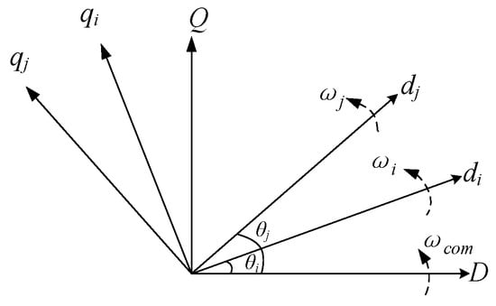 The reference coordinates D-Q rotate with an angular speed of ωcom. The di-qi coordinate system and dj-qj coordinate system represents the coordinate of inverter i, j, which rotates with the angular speed of ωi and ωj. θi and θj represent the angular difference between the rotational coordinate of VSG i, j and the uniform rotational coordinate.