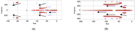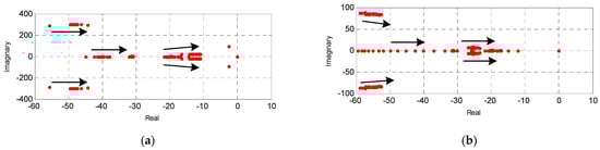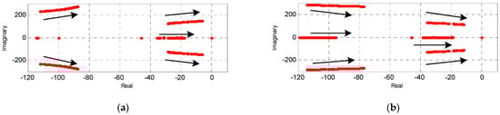 Figure 6a,b shows the root trajectories of the system when the active droop coefficient Dp changes from 0 to 500 and the reactive droop coefficient Dq changes from 0 to 1000.