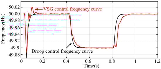 As shown in Figure 10, when the load is connected in 0.4 s, the droop control strategy frequency curve decreases rapidly, while the frequency curve of the VSG control strategy decreases to the same frequency at about 0.6 s due to the existence of inertia. In addition, the frequency curve of the droop control strategy rises rapidly when the load is cut off in 0.8 s, while the VSG control strategy returns to stability at 1s. It can be seen that compared with droop control, VSG control can alleviate the impact on the system during load switching.