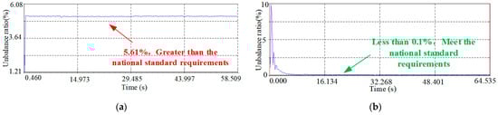As shown in Figure 11a, the imbalance ratio of the system that does not contain the harmonic imbalanced suppression loop reaches and remains at 5.61% soon after the experiment begins. It indicates that the system generates great voltage imbalances when the under imbalanced load and the voltage waveform is distorted. In Figure 11b, the imbalance ratio can be reduced from 5.61% to less than 0.1%, which fully meets Chinese national standards by introducing an imbalanced suppression loop to the parallel system.