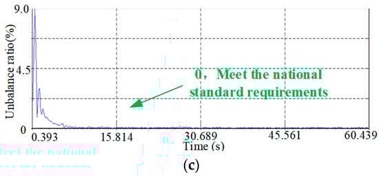 When the secondary control strategy is added in Figure 11c, the fluctuation of the voltage imbalance is not affected, and stability can still be achieved. The imbalance ratio is close to 0, which indicates that the secondary control strategy does not affect the imbalance suppression loop.