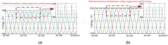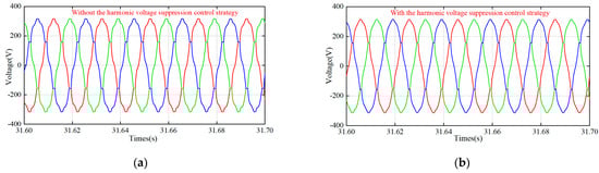 As shown in Figure 13a, the experimental results for the voltage waveform of microgrid for PCC point are distorted. In Figure 13b, the voltage waveform is obviously improved after adding the harmonic voltage suppression of the multi-inverter parallel VSG control strategy, which indicates the effectiveness of the proposed harmonic suppression strategy.