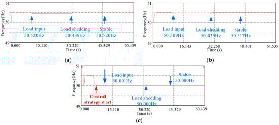 As shown in Figure 14, frequency deviates from the standard value, and frequency fluctuation occurs when the system load is altered. In Figure 14a,b, where a secondary control strategy is lacking, when the system is added with a 5 kW active power load from 10 s to 30 s, the frequency of the microgrid is reduced from 50.520 to 50.436 Hz due to the inertia of the VSG. Figure 14c shows that after adding the secondary control strategy, the load switching fluctuation is reduced to 10 s and 30 s, and the frequency is stable at the rated value 50 Hz.