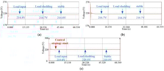 As shown in Figure 15a,b, similar to system frequency control, when the system power fluctuates, the system voltage amplitude will also produce different degrees of fluctuation. Furthermore, according to the inertia of the VSG, when the system power changes significantly, the voltage amplitude will also produce a significant deviation. In Figure 15c, by adding a secondary control strategy, the effective value of the PCC voltage can be stabilized at the rated 220 V, which meets the load power supply requirement, and the system stability voltage control effect is enhanced significantly.