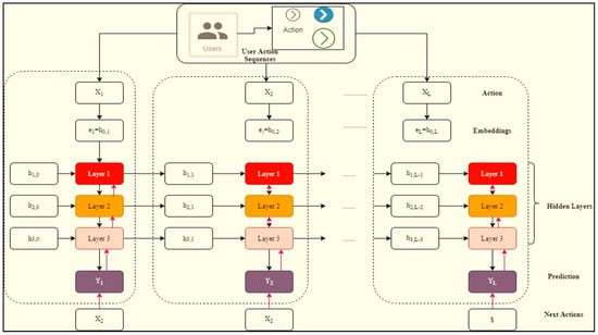 Figure 3 illustrates that the LSTM based training process consists of input, embedding, hidden, and output layers. Each layer performs a specific function, and respective user behavior features are extracted. As discussed earlier, the output at time instance t is obtained by processing user actions = in the LSTM network hidden layer . The dictionary should be created for IoT users and individual actions, which helps identify user behavior features. If the user logs into the IoT device after an hour, that is represented as one, and logged off the IoT device after an hour, defined as 2. These actions are converted to the one-vector format to get the exact user behavior in the hidden layer process. The network generally has the input, weight, and bias values used to predict the output. The three hidden layer process is defined as follows:
