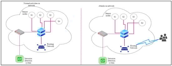 Consider that the IoT network has a different number of nodes, in which one node is treated as a server node, and the remaining nodes are a client for data transmission and analytic processes. Here, traffic is continuously monitored to eliminate the modification on live traffic; every user action (data transmission) server responds to the client sender node by providing replies. The sensor node’s behavior must be analyzed to eliminate the intermediate action during this process. Then, the IoT communication behavior and attacks are illustrated in Figure 4.
