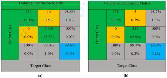 Figure 5 represents the confusion matrix value of training, testing, validation, and overall confusion matrix. The confusion matrix formed according to the false positive rate (FP) (indicates the correct classification of the regular events: yellow box) and true positive rate (TP) (measures the right category of attack events: green box). Then, the adequate training and learning process improves the overall classification rate up to 99.6%. It was able to detect the DDoS attacks in IoT network traffics. The practical computation of this process improves the general network security and alerts the data transmission team in the earlier stage by avoiding network disruptions. Further, the performance of the system is evaluated using accuracy (Acc), measuring the exact detection from entire data instances; Detection Rate (DR), intrusion instances ratio; False Alarm Rate (FAR), misclassification of normal instance; Precision (Pre), how many attacks are classified correctly; and Recall (Re), detecting how many attacks are done in the model return.