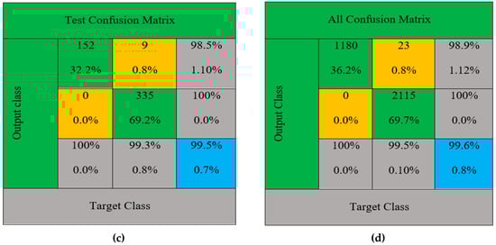 Confusion matrix of classification results: (a) training, (b) validation, (c) test, and (d) full.