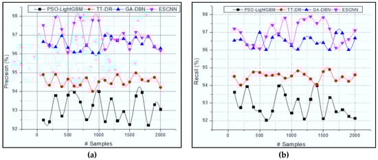 According to Figure 6a, the ESCNN approach predicts the abnormal activities, i.e., threat in IoT environment, by analyzing the user action sequences Using the LSTM layers, the extraction of helps to identify the normal and abnormal activities while the user tries to execute the IoT environment. A sparse matrix is generated . That minimizes the computation complexity while extracting different activities in the IoT. The successful identification of user behavior improves overall precision. Specific abnormal events are predicted from the analyzed behavior using practical computation of . The system minimizes the deviations in the fine-tuning phase . The system improves the threat prediction rate and minimizes the false alarm rate (Figure 7).