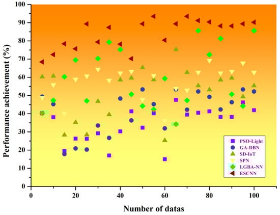 The discussed evolutionary sparse convolution network (ESCNN) classifies the abnormal activities in a reliable and the fastest manner. The successful formulation of sparse matrix features from data traffic reduces the computation complexity with maximum accuracy. The obtained accuracy result is illustrated in Figure 6. The introduced ESCNN approach compared with existing research approaches such as Particle swarm optimization with gradient descent algorithm (PSO-Light) [], genetic optimized deep belief network (GA-DBN) algorithm [], Two-tier classification model, and dimension reduction algorithm (TT-DR) [].