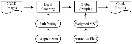 - Zou, Q.; Li, Q.; Zhang, F.; Xiong, Z.; Wang, Q. Path voting based pavement crack detection from laser range images. In Proceedings of the 2016 IEEE International Conference on Digital Signal Processing, Beijing, China, 16–18 October 2016; pp. 211–215. [Google Scholar]