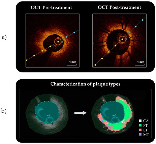 OCT images were used for the reconstruction of the patient-specific artery and plaque: (a) good OCT image quality was required both for the reconstruction of the artery from the OCT pre-treatment images and for the quantitative comparison of the OCT post-treatment lumen areas and model results; (b) a CNN was used to characterize the plaque types (calcified plaque (CA), fibrous tissue (FT), lipid tissue (LT), mixed tissue (MT)) from patient OCT images.