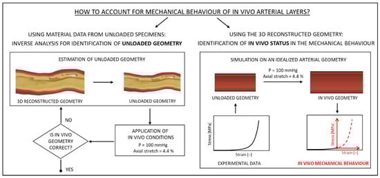Schematic representation of two potential methods to account for the mechanical behavior of in vivo arterial layers as the experimental data to be associated with the reconstructed in vivo geometry are derived from testing unloaded specimens. On the left is shown a simplified scheme describing the rationale for identifying the unloaded geometry to be used with the experimental material data: by inverse analysis, the unloaded geometry is iteratively estimated from the geometry reconstructed from the in vivo images. On the right, an alternative, simpler method is proposed: through simulations on an idealized arterial geometry of the artery, the working point corresponding to the in vivo status was identified in the experimental material data for the extrapolation of the in vivo mechanical behavior.