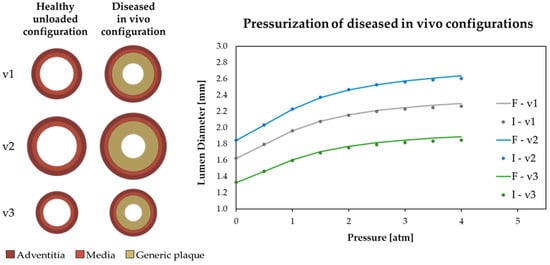 Validation of the strategy for modeling the media and adventitia layers with isotropic material calibrated on the circumferential in vivo behavior. On the left are the three different sizes of the healthy unloaded configuration of the idealized artery considered in the study: lumen diameters of the healthy unloaded artery of 2.7 mm (v1) (the one used for material calibration without the plaque), 3.2 mm (v2) and 2.2 mm (v3) were chosen. Starting from these geometries, three different configurations of diseased in vivo vessels were derived considering the deformations of media and adventitia under in vivo conditions and the addition of a generic plaque such as to model a 50% stenosis of the healthy lumen. Simulations of lumen pressurization of the three diseased in vivo configurations were performed for a comparison between the isotropic model calibrated on the in vivo circumferential behavior (I) and the fiber-reinforced model accounting for stresses and strains starting from the unloaded configuration (F). On the right are the simulation results in terms of lumen diameter versus the applied pressure increment beyond the physiological pressure value of 100 mmHg.
