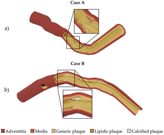 Starting from the clinical images of the two patients, the sections of interest of each coronary artery were 3D reconstructed and meshed according to the rules defined in Section 2.1. The identification of plaque components suggested in the stented region a relevant presence of lipid plaque for case A with a volume percentage of 36% with respect to total plaque volume, compared with 14% of case B. For both cases, the calcified plaque was identified in localized spots with a volume percentage of less than 2%. The reconstructed geometry with the spatial distribution of the modeled artery components is shown in Figure 6 for both cases.