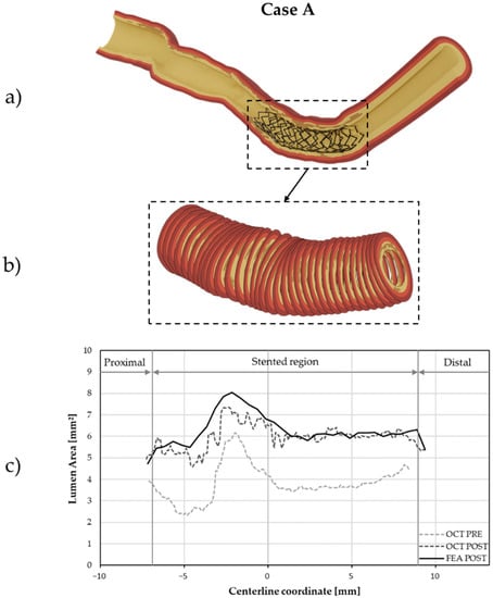 The coronary artery models were evaluated, replicating the clinical treatments of Case A and Case B. The FEA results related to Case A are shown in Figure 7. As can be seen from the 3D artery section at the end of treatment, in the numerical simulation, the stent deployment was able to reduce the stenosis. The slices of the stented artery region, made by cuts orthogonal to the vessel centerline (Figure 7b), allowed the quantification of the lumen area for comparison with the clinical data. Figure 7c shows the values of lumen area as a function of the location along the vessel centerline. The post-treatment area derived from OCT images appears to be adequately estimated by FEA: a good fit between the graph curves can be seen along the whole stented region. Similarly, for Case B, starting from the 3D artery geometry at the end of treatment (Figure 8b), the area values estimated with FEA were compared with the clinical data. Figure 8a shows the good predictive capability of the model in assessing the area values achieved in post-treatment configuration, despite some local inaccuracies. As Case B involved a bifurcation in the stented region, the area affected by the bifurcation was not considered in the lumen area comparison. In both cases, a good apposition of the stent to the vessel wall along the entire stented region was predicted by the simulation, consistent with what was observed in post-treatment OCTs.