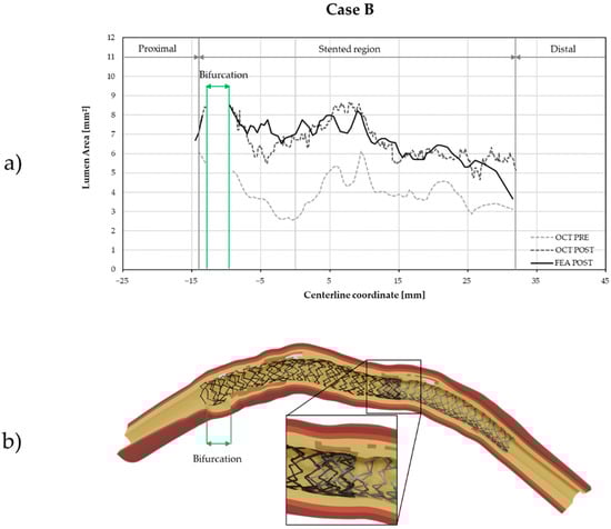 Numerical simulation results for the replication of Case B: (a) graph of the lumen area as a function of the centerline coordinate with the curves related to the clinical data deduced from pre- and post-treatment OCTs and the FEA results. The region corresponding to the bifurcation was not considered in the lumen area comparison; (b) the geometry of artery section and stent at the end of clinical treatment with detail on the region with overlapping stents.
