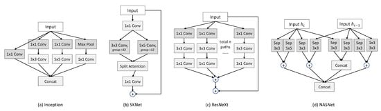 where x is the input of the block; can be any arbitrary function (such as weighted sum, concatenation, or element-wise addition) to merge the results of the set of transformation ; c is the number of ; and can be a different set of operations (e.g., Conv, FC, Activation, etc.) on the ith branch. Taking the Inception block (Figure 1a) as an example, the input is fed into four branches. The first branch of the Inception block has one layer of 3 × 3 convolution, while the second to fourth branches stack two layers together. At the end of the block, the results from each branch are merged by Concat.