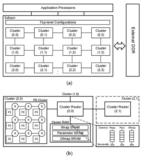 Hardware architecture. (a) Hardware architecture: top level; (b) Hardware architecture: cluster (2, 0). R: PE router.