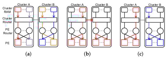 Cluster RAM: Each cluster also contains a group of static RAM (SRAM) banks, namely cluster RAM, for storing the run-time data for the PEs. Compared to the conventional DNN accelerators (e.g., references [,]), in which all PEs access a globally shared external memory, the partitioned memory effectively reduces transaction delay and resource contention during memory accesses, since most of the data fetch from the PEs can be handled within the same cluster. This partitioned memory hierarchy considerably reduces the power and time consumption caused by memory accesses and contentions in the conventional DNN accelerators. Each cluster RAM has three groups of RAM banks, storing Ifmaps, parameters, and Ofmaps. These banks are connected to the corresponding communication channels of the cluster router.