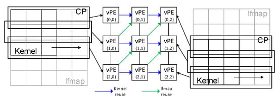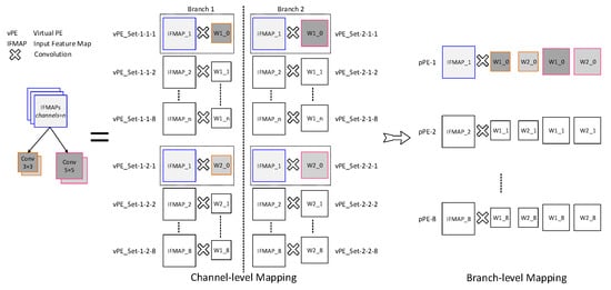 The left-hand side of Figure 8 shows an example of the vPE sets created for the first CONV layer in a dual-branch network. In this example, the size of the Ifmap is (); both branches have eight input channels () and two output channels (); and the kernel sizes in these two branches are and , respectively. After the channel-level mapping, it creates 16 () sets of vPEs for each branch (32 in total). We denote the vPE set for the mth input channel and nth output channel in the bth branch as vPE_Set-b-n-m. For instance, we denote the vPE sets for the third input channel and second output channel in the first branch as vPE_Set-1-2-3.