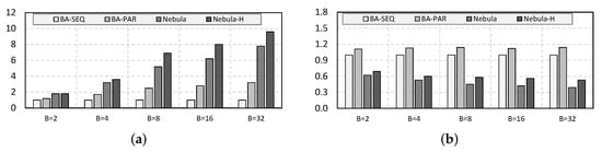 Experimental Setup: To evaluate the effectiveness of Nebula performing on multi-branch blocks against the existing DNN-inference accelerators, we carried out experiments on blocks with a different number of synthetic workloads, i.e., branches (B). Since convolutions account for over of DNN operations and dominate the run-time [,], each branch was constructed with a convolution with a random kernel size. We performed the experiments 1000 times, and recorded the average throughput and run-time energy cost. For each experimental configuration, we normalized the results using BA-SEQ.