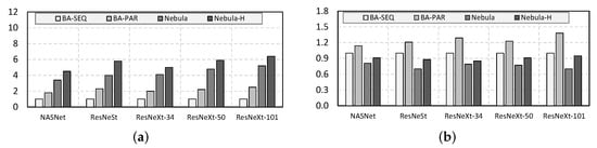 For the baseline DNN accelerators (BAs), however, different variants were demonstrated in the previous work. As reviewed in Section 1, existing MCS frameworks usually execute DNN multi-branch blocks by either using sequential execution (SEQ) or partitioned execution (PAR). Therefore, we built two BSs (i.e., BA-PAR and BA-SEQ) using the methods introduced in references [,], respectively. All evaluated accelerators were executed at 150 Mhz and configured to run at full performance. It is important to note that the modularized design of Nebula (see Section 3) allows it to be configured with any number of clusters.