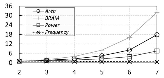 Experimental Setup: We adopted the same method described in Section 5.1 to synthesize and implement Nebula with a scaling number of clusters []. In the experiments, we introduced a scaling factor: , to control the number of clusters (). The experimental results showed the scalability of the consumption of area, memory, and power, as well as maximum clock frequency. The results are normalized with the four-cluster Nebula.