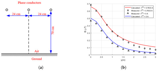 The method for the calculation of magnetic flux density harmonics in the vicinity of overhead lines is validated by the comparison of calculated magnetic flux density with measurement results given in the literature [26]. The measurements correspond to the three-phase configuration where conductors are placed at the same height, as shown in Figure 1a. Magnetic flux density calculation and measurements are performed at ground level over the considered lateral profile in increments of 25 cm. Two cases are examined, without the presence of higher current harmonics, and with the presence of third current harmonic. The phase current intensity RMS value during the measurements is 4.58 A at frequency 16.666 Hz, and the third harmonic current intensity is 0.7633 A at frequency 50 Hz [26]. For both cases, the comparison of magnetic flux density measurement results and the obtained calculation results for the considered test case are given in Figure 1b.