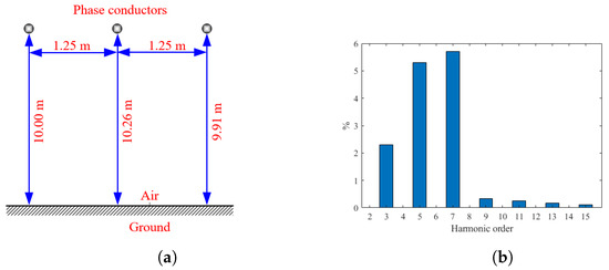 Considered 35 kV horizontal overhead distribution line case. (a) 35 kV overhead distribution line configuration. (b) Current harmonic spectrum.