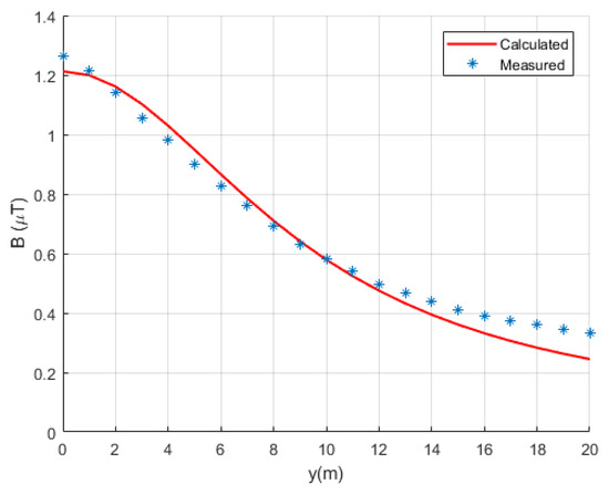 A comparison between the measured and calculated magnetic flux density values is presented in Figure 3. It can be noted that the results of measurements and the calculations of magnetic flux density closely match. For this case, the calculated value of the mean square error equals .