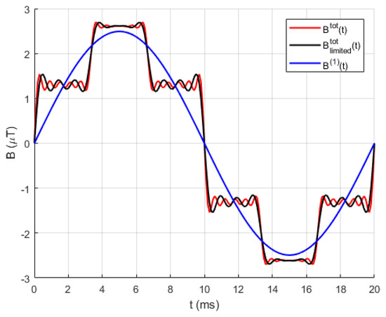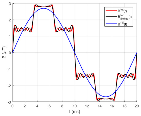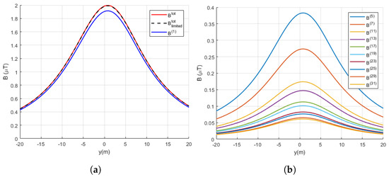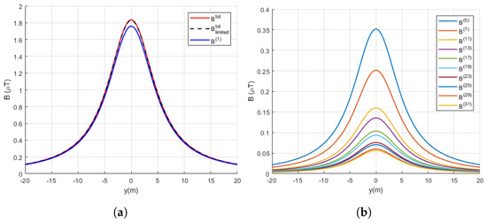 The comparison of magnetic flux density distribution for fundamental harmonics as well as the total magnetic flux density, where contributions of the entire analysed harmonic spectrum and limited harmonic spectrum are considered, are shown in Figure 8a. The magnetic flux density of higher order harmonics over the considered lateral profile is shown in Figure 8b.