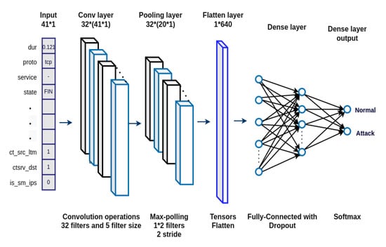 1. Azizjon, M.; Jumabek, A.; Kim, W. 1D CNN based network intrusion detection with normalization on imbalanced data. In Proceedings of the 2020 International Conference on Artificial Intelligence in Information and Communication (ICAIIC), Fukuoka, Japan, 19–21 February 2020; pp. 218–224. [Google Scholar]