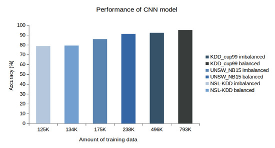 In this work, we expanded and developed our previous work [1] that adapted DL models for network intrusion detection by using flow-level data. In this regard we exploited flow-level datasets such as KDD Cup99, NSL-KDD, and UNSW NB15. We applied CNN, LSTM, GRU, RNN, and hybrid CNN and LSTM DL models, the size of the batch was set to 32, the Adam optimizer with a learning rate of 0.0001 for all networks. We implemented all models by ourselves and trained on both the balanced and imbalanced data of three different datasets by using GPU CUDA acceleration. Three different datasets created header-based high-level data. This method does not depend on IP addresses or payload data. More and balanced data significantly affects DL models as shown in Figure 6.