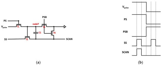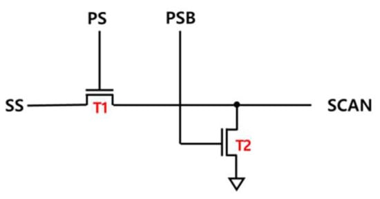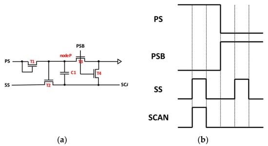 A unit stage of the proposed scan driver and its timing chart are shown in Figure 1a,b. When PS is high, TFT T1 is turned on and node P is charged with the high voltage of the PS signal, which turns on TFT T2. The scan output then becomes high when SS becomes high. Increase of the scan voltage bootstraps node P’s voltage up using coupling capacitor C1. Bootstrapping the gate voltage of T2 reduces the threshold voltage loss of the scan output. The voltage of PS should be higher than SS by more than the threshold voltage in order to avoid output-voltage loss and low on current because is given by . Low Vgs results in a drop of the output voltage and long rise and fall times of the output pulses. The bootstrapped gate voltage of the drive TFT reduces the rise time of the output pulse by increasing the current driving ability.