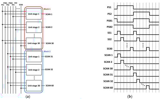 Block diagram of the proposed scan driver (a) and its timing chart (b).