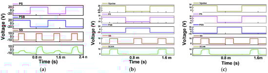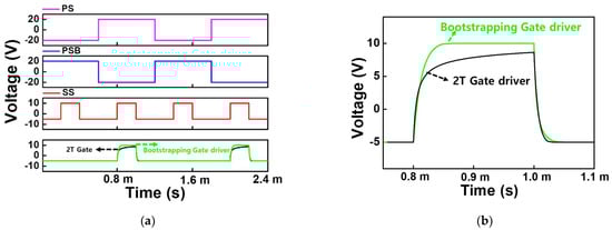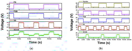 Figure 3a shows simulation results for both the unit stage of the proposed scan driver and a scan driver with two switch TFTs, as shown in Figure 4. PS, PSB, and SS signals are shown, and the output pulses are shown at the lowest. The pulses from both the circuit in Figure 4 and the proposed one are shown and replotted in Figure 3b. Output voltages in Figure 3b show the effect of bootstrapping in the proposed circuit—the voltage loss was reduced for the proposed circuit. Increasing the gate voltage of the drive TFT by bootstrapping shortened the rise time and reduced the voltage drop in the output. Table 1 shows that the rise time decreased to 26.9 μs from 174.5 μs, and the ratio of the output voltage to SS increased from 0.863 to 0.999.