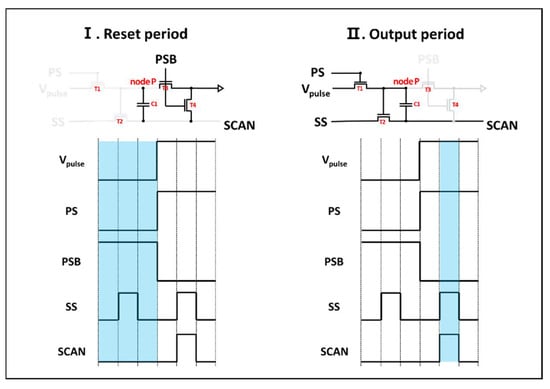 The operation of the modified bootstrap scan driver is shown in Figure 6. In the reset period, the PSB signal is high, and TFTs T3 and T4 are turned on. The scan line of the previous stage is initialized through TFT T4. In addition, since Vpulse is in a high state, a high voltage of Vpulse is charged in node P, which in turn turns on T2. In the output period, PS and Vpulse become high, which turns on TFTs T1 and T2. When SS becomes high in the output period, the scan output increases, which bootstraps the node P voltage through coupling capacitor C1. The PS low voltage should be lower than that of Vpulse to make T1 be in an off state, which enables the bootstrapping in node P by the low leakage of T1. The increased gate voltage of T2 by bootstrapping prevents voltage loss of the SS output to the scan line.