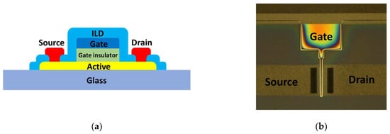 Drive circuits were fabricated using an a-IGZO TFT process on a glass substrate. The cross-sectional structure and a microscopic image of the top-gate a-IGZO TFT are shown in Figure 10a,b, respectively. A 50 nm-thick active layer of a-IGZO was deposited by RF magnetron sputtering with Ar gas mixed with O2 gas (Ar:O2 = 22.5 sccm:7.5 sccm) using an IGZO target (In2O3:Ga2O3:ZnO = 2:1:2 in mole ratio). The working pressure was 5 mTorr, and the power was 50 W.