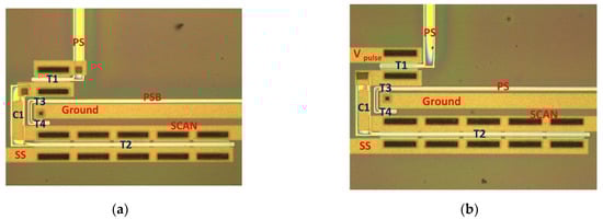 Microscopic images of fabricated drivers are shown in Figure 12a,b. Figure 12a shows the bootstrap scan driver, and Figure 12b shows the modified bootstrap scan driver. The circuit area of a unit stage was μm. The design parameters of the scan drivers are indicated in Table 4. In order to ensure driving capability, the size of the drive TFT, T2, was designed to be the largest among all four TFTs. T3 and T4 are TFTs for reset. The difference between Figure 12a,b is whether T1′s gate is connected to the drain or not. In the modified bootstrap scan driver, the drain of T1 is not connected to the gate and is connected to Vpulse.