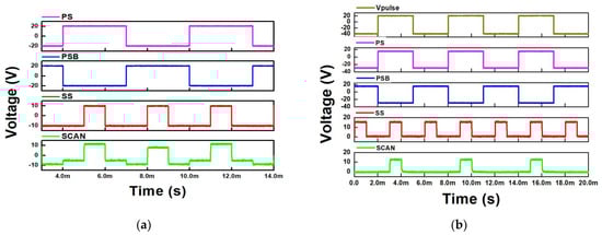 The measurement results of the bootstrap scan driver and modified bootstrap scan driver are shown in Figure 13 with waveforms of input signals. There were errors in the bootstrap scan driver’s output waveform, while the modified bootstrap scan driver showed a good output waveform without errors. The modified bootstrap scan driver eliminated errors by appropriately adjusting the Vpulse signal connected to the drain of T1 and the PS signal connected to the gate of T1.
