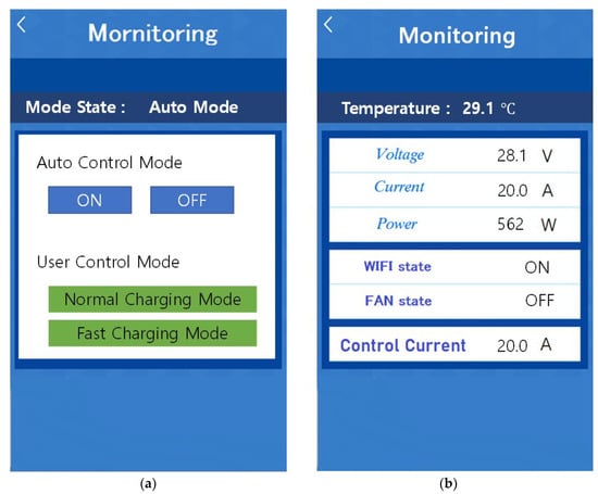 Figure 2 shows a smartphone application; the main function is to show the Charging Controller and Monitoring interface. Figure 2a shows the Charging Controller, where the user can select between Auto Control Mode and User Control Mode. The charging current is automatically determined by considering the temperature of the Auto Control Mode. Auto Control Mode determines the control current in real-time according to the temperature state and charges it. In the case of rapid charging, by applying a large current to the battery, it is charged faster than normal charging. Therefore, rapid charging may cause problems of temperature rise of the battery and fire. In the case of the proposed Auto Control Mode, it is charged to determine the reference value of the current according to the temperature state. There is an advantage in that the battery can be safely charged by considering the temperature state.
