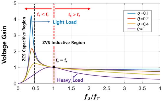 The voltage curve graph can be expressed through Figure 4. Additionally, the graph is drawn by MATLAB, version 2017 (MathWorks, Boston, MA, USA). It can be seen from the voltage gain curve that a boundary exists between the inductive impedance and capacitive impedance. Therefore, the inductive and capacitive operating area can be divided into ZVS and ZCS region. The purpose of defining the two domains is an inductive operation over the entire input voltage and load current range. ZVS operation takes place in the inductive region. Moreover, in capacitive operation, the current leads the voltage. In the switching operation of MOSFET, when the switch is turned off, a reverse current flow through the body diode of the MOSFET. The current flows through the body diode to perform hard switching. In addition, reverse recovery losses and noise may occur as the other MOSFET turn on, resulting in high current [26,27,28].