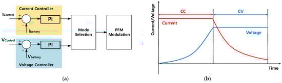 This section shows the proposed controller block diagram and the flowchart of the IoT-based controller. The CC/CV charging method is a widely used method for charging lead-acid batteries and lithium-ion batteries. The CC (Constant Current) method is a method of charging with a current with a constant control value. The CV (Constant Voltage) method is a charging method based on a voltage of a constant control value. Figure 5a shows the control block diagram of CC/CV charging method. The two charging methods are the method of controlling the current and voltage through PFM control through the PI controller according to the reference value. A PFM signal is applied to the switching element of the LLC resonant converter, and the desired output is obtained through a switching operation accordingly. Figure 5b shows the voltage/current charging graph; when the battery starts charging, it is initially charged with a constant control current through the CC method. As charging proceeds, the voltage gradually rises. When the voltage rises to the set value, from then on, it charges in CV mode. In the constant voltage state, the value of the current gradually decreases, and charging is complete when the current decreases to near zero. The CC/CV charging method, as shown in Figure 5b, is the most widely used charging method. In addition to the CC/CV charging method, there are the CC charging method and the CV charging method; however, in the CC charging method, the voltage of the closed-circuit due to the internal resistance of the cell becomes higher than the voltage of the device itself, and thus 100% charging is not possible. In the CV charging method, an overcurrent may occur due to the potential difference in the initial voltage.