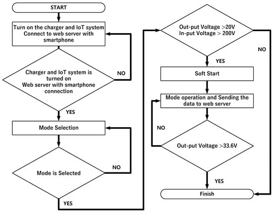 The operation of the proposed system starts with the operation of the IoT system and the charging system. In the initial start, the charger and IoT system are operated. After operation, the IoT system creates a web server and uploads data to the web. The smartphone app accesses the web server and reads data. Check the operation and connection status of the IoT system, smartphone app, and charger. If all the system states are not satisfied, the initial operation is restarted. When the operation and connection status of all systems are satisfied, the charging mode is selected through the smartphone app. Charging does not start until the mode is selected, but waits for the mode to be selected. When the charging mode is selected, the connection status of the battery and the readiness for charging are checked through the data of the output voltage and input voltage. If the output and input voltages are not met, the operation is terminated. When the values of the output and input are met, the soft-start starts charging. Once charging starts, the charging status is transmitted to the web server, and the user can check the data. Charging is repeated until it reaches 33.6V, and data are sent to the web server in real-time. When 33.6V is met, charging is terminated. When charging is finished, the Mode State of the first interface of the app is displayed as Finish.